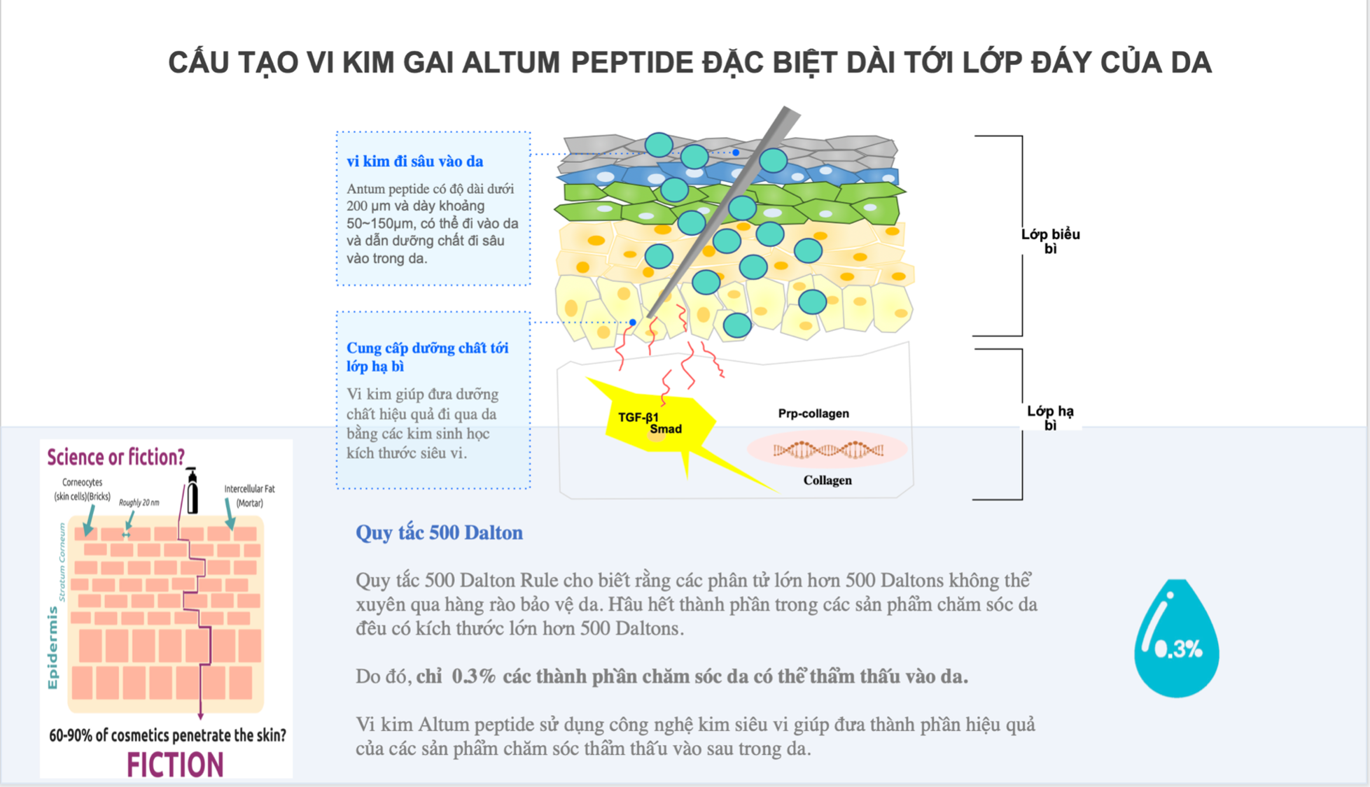 Công nghệ vi kim (Altum Peptide) là công nghệ mà vi kim có đính các phương tiện vận chuyển hoạt tính đưa vào sâu trong da bao gồm peptide. Chúng cung cấp nguyên liệu, oxy giàu dưỡng chất thực vật nuôi cấy tới lớp đáy của da. Sắp xếp lại hệ Collagen và Elastin, tăng độ đàn hồi, khôi phục làn da bị tổn thương, lão hóa, da trở nên sáng khỏe, căng tràn sức sống.